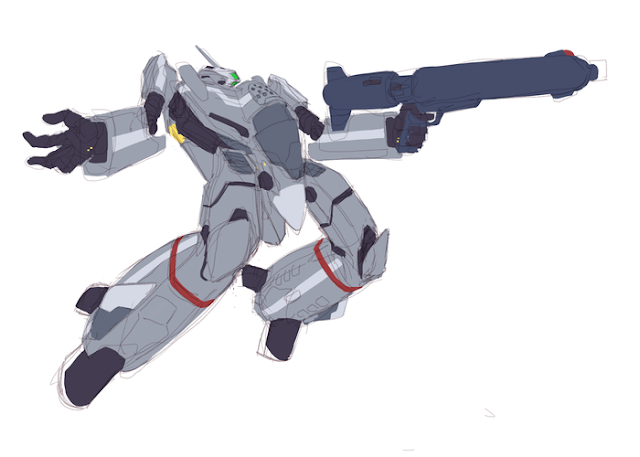More basketball streetfighters, sketches and a bit on the coloring process with a Macross battroid (VF-0A) below. First step is the digital sketch, very loose actually, then some flat colors to define the silhouette and in the 3rd step I added the lines on top of it. I may seem weird to do it in this order (lines after the colors) but it was actually very intuitive to do it that way as it helped me refine the shapes more naturally than if I did it while inking, as I'm not focused on the linework itself and can instead have a macro look at the shapes. Finally I added the basic lighting and on top of it a soft light layer to add some environment lighting (redish).